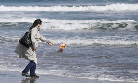 ومع شروق الشمس في هيسانوهاما، التابعة لمنطقة فوكوشيما، تجمع عدد من السكان على الشاطئ حيث سار صف من الرهبان البوذيين أمامهم وهم في صلاة يصاحبها قرع للطبول.