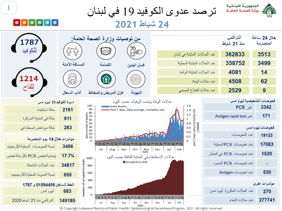 0 شارك FacebookTwitterGoogle+ReddItWhatsAppPinterestالبريد الإلكتروني اعلنت وزارة الصحة العامة تسجيل 3513 اصابة جديدة رفعت العدد التراكمي للحالات المثبتة الى 362833. كما تم تسجيل 62 حالة وفاة. وجاء في التقرير: المزيد من المشاركات وزارة الصحة تدين استهداف مستشفى ميس الجبل الأبيض يعلن جهوزية وزارة الصحة للطوارئ الأبيض يتفقد مستشفى “المقاصد”: مستمرون بدعم أدوية… تقرير وزارة الصحة كورونا 0 شارك
