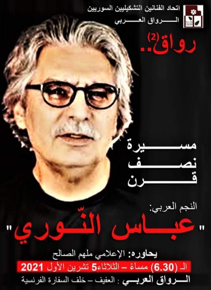 برعاية “إتحاد الفنانين التشكيليين السوريين”، يكرّم، عند الساعة السادسة والنصف مساء غد الثلثاء 5/10/2021، “الرواق العربي” في نسخته الثانية النجم العربي السوري عباس النوري، في مقره (العفيف – خلف السفارة الفرنسية) بدمشق، يحاوره الإعلامي ملهم الصالح حول تجربته ومنجزه الإبداعي على امتداد 50 عاما.
