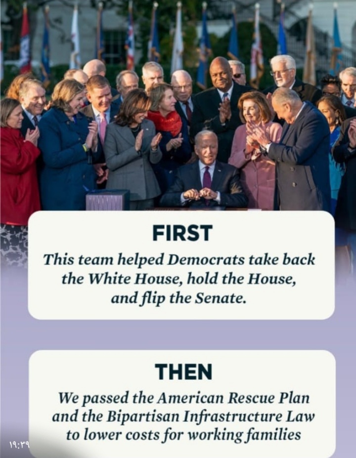 يمهد الديمقراطيون الطريق لهذه الأمة لإعادة البناء بشكل افضل من اي وقت مضى، ويعود سبب انتعاشنا الاقتصادي الذي حطم الأرقام القياسية، في جزء كبير منه، إلى خطة الإنقاذ الأميركية التي مرت دون تصويت جمهوري واحد في الكونغرس، بحيث أنه لم يكن هناك اي شيء لم نتمكن من فعله عندما فعلناه معا”.